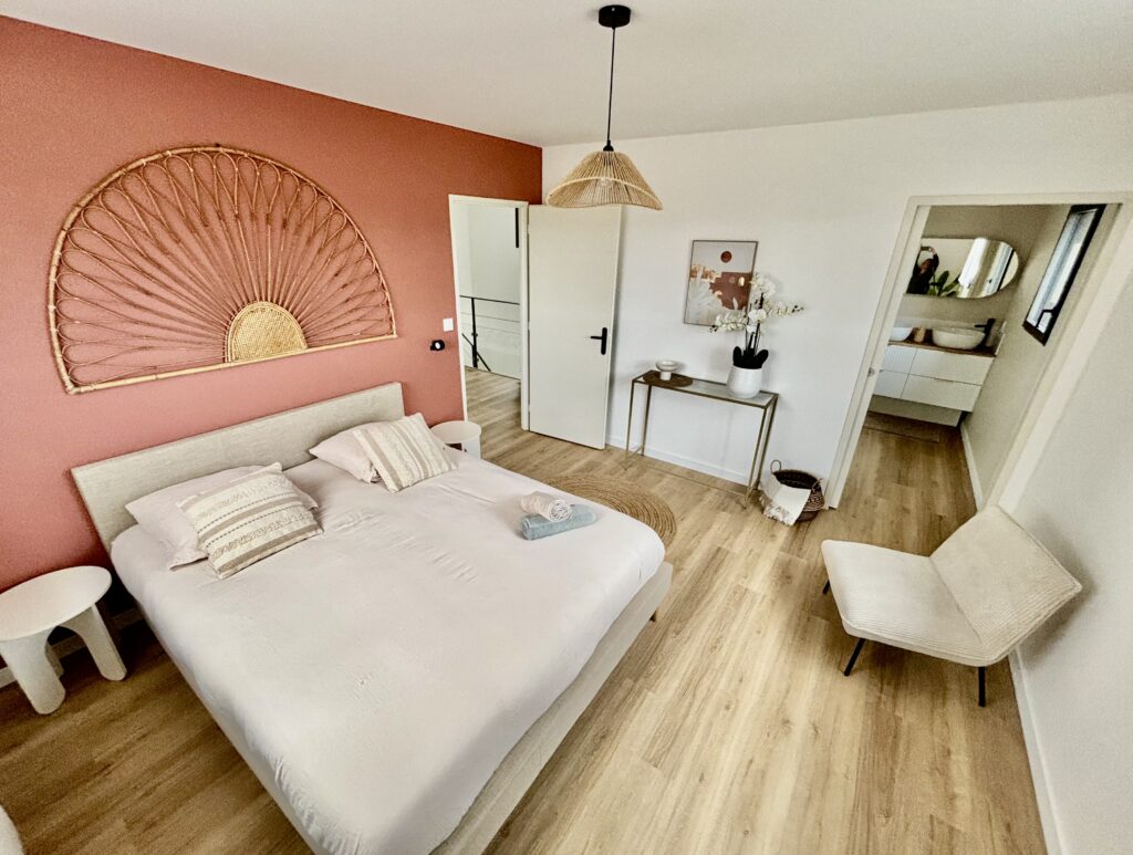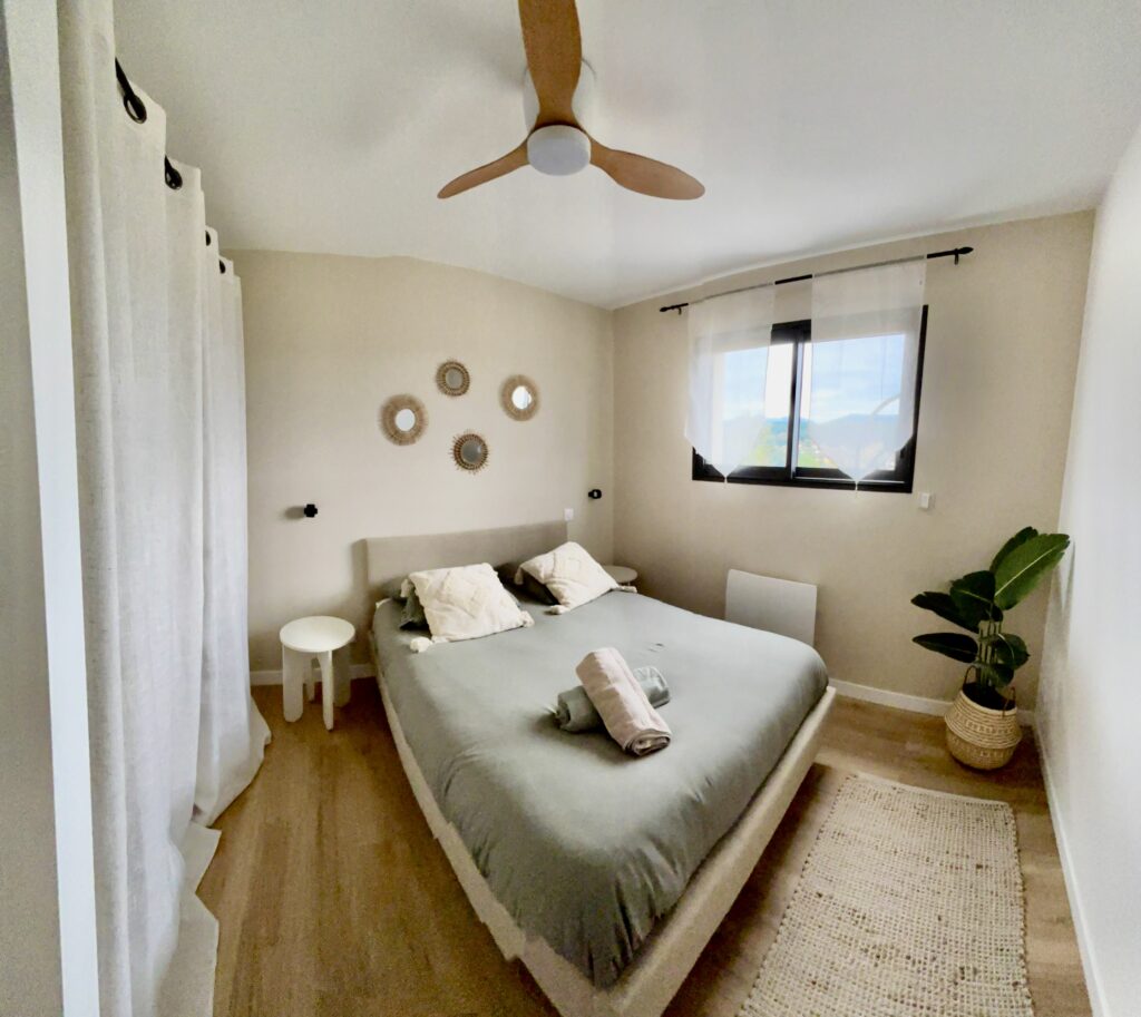 La Villa Aimée propose trois chambres confortables, dont une au rez-de-chaussée et deux à l’étage. Chacune dispose d’une literie de qualité, de rangements fonctionnels et d’un équipement adapté au confort de chacun (ventilateur, plafonnier ou climatisation à l’étage).