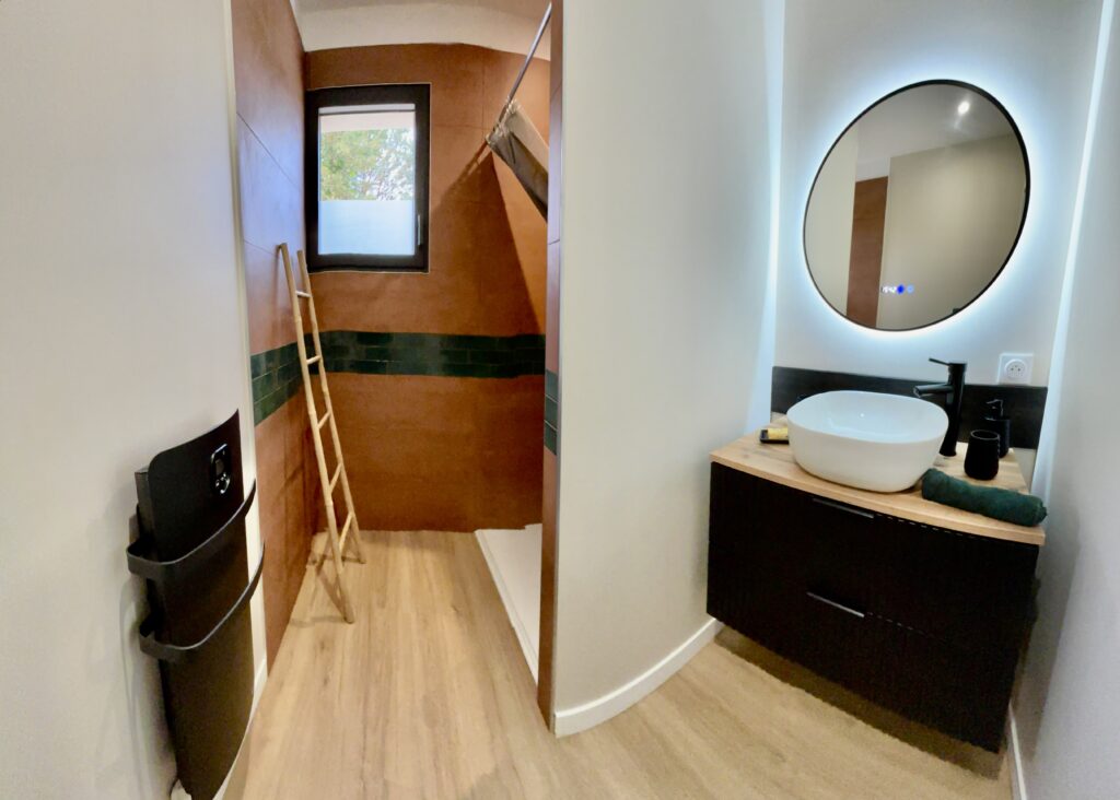 La Villa Aimée dispose de deux salles de bain modernes : l’une située au rez-de-chaussée, équipée d’une vasque contemporaine, et une seconde à l’étage, intégrée à la suite parentale en salle d’eau privative.